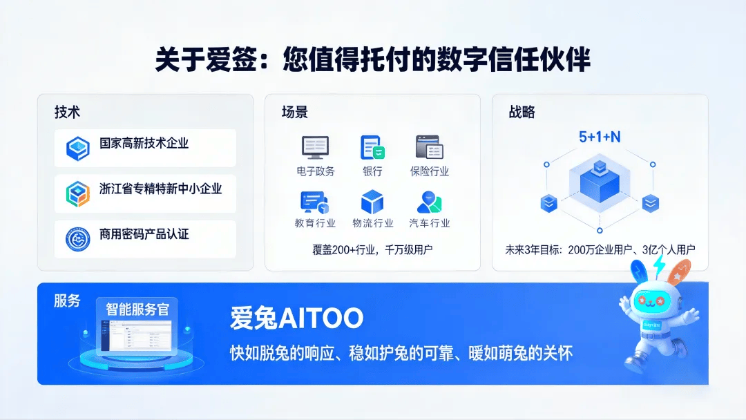 我们深知,可靠的技术需要极致的服务来传递。为此,爱签已启动全国客户服务中心,并正式推出智能服务官——“爱兔AITOO”,寓意以 “快如脱兔的响应、稳如护兔的可靠、暖如萌兔的关怀” ,为客户提供全生命周期的安心服务。
