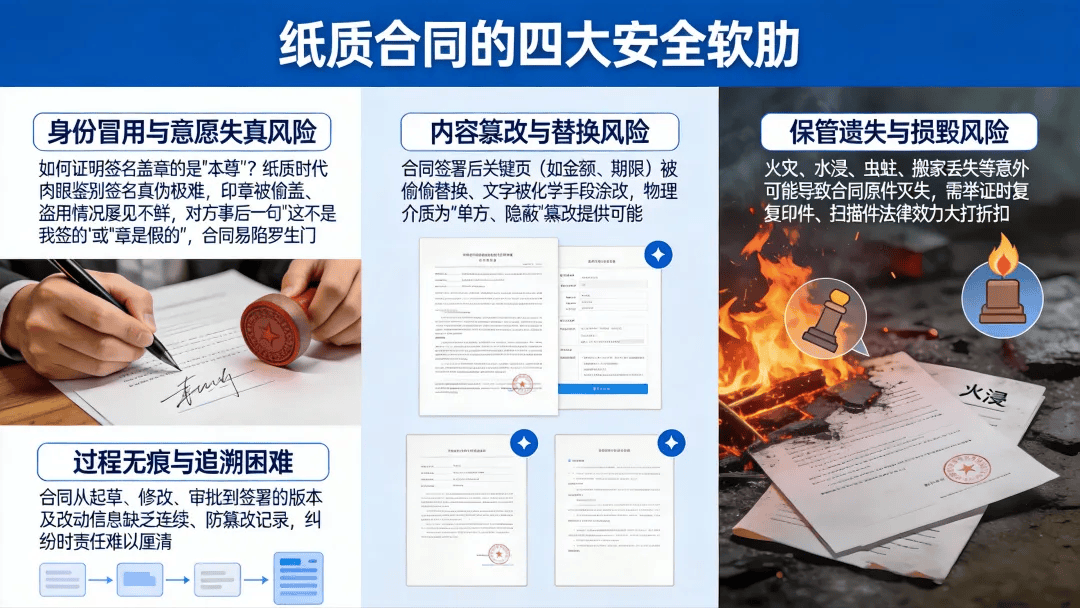 我们感觉纸质合同可靠,往往源于其物理存在带来的“掌控感”。然而,这种可靠在复杂的商业环境和人为因素面前,实则脆弱: